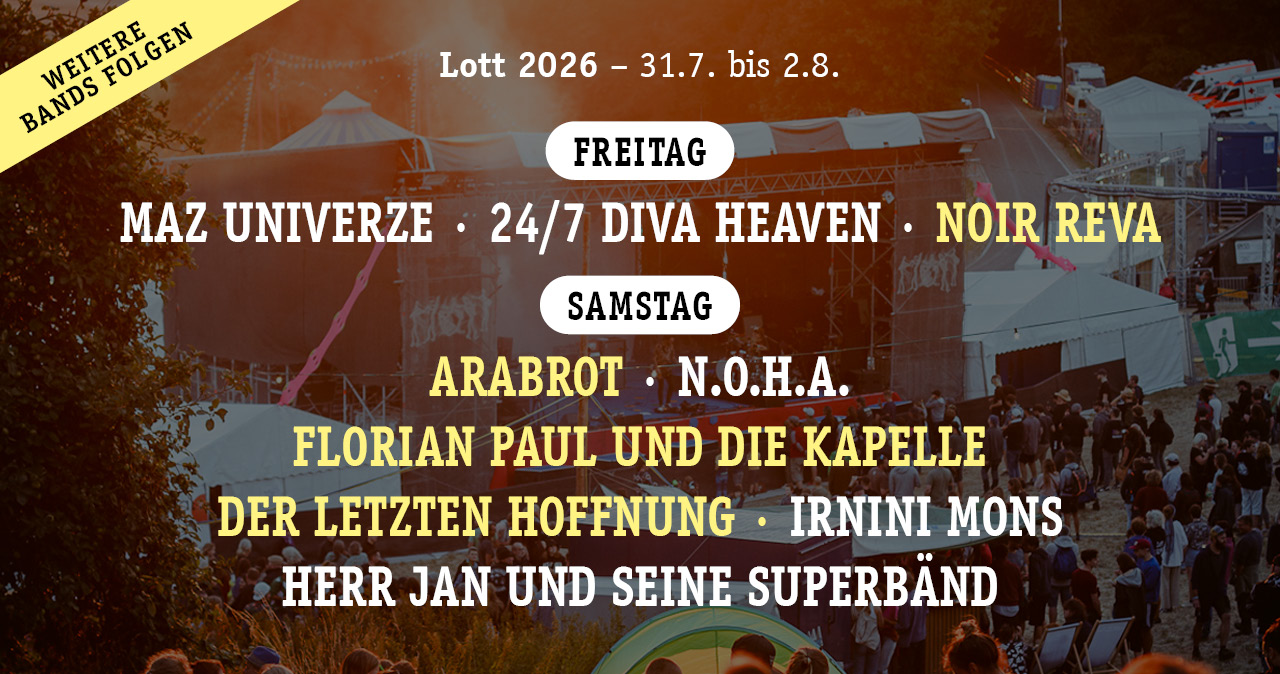 Lott 2026 Vorverkauf ab 17.10. Liebe Lott-Familie, die Planungen für die Lott 2026 laufen auf Hochtour! Wichtige Weichen sind gestellt und sobald es Handfestes zu berichten gibt, werden wir euch hier auf der Homepage ... weiterlesen